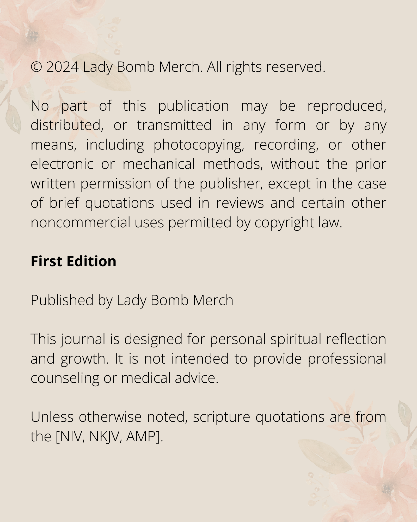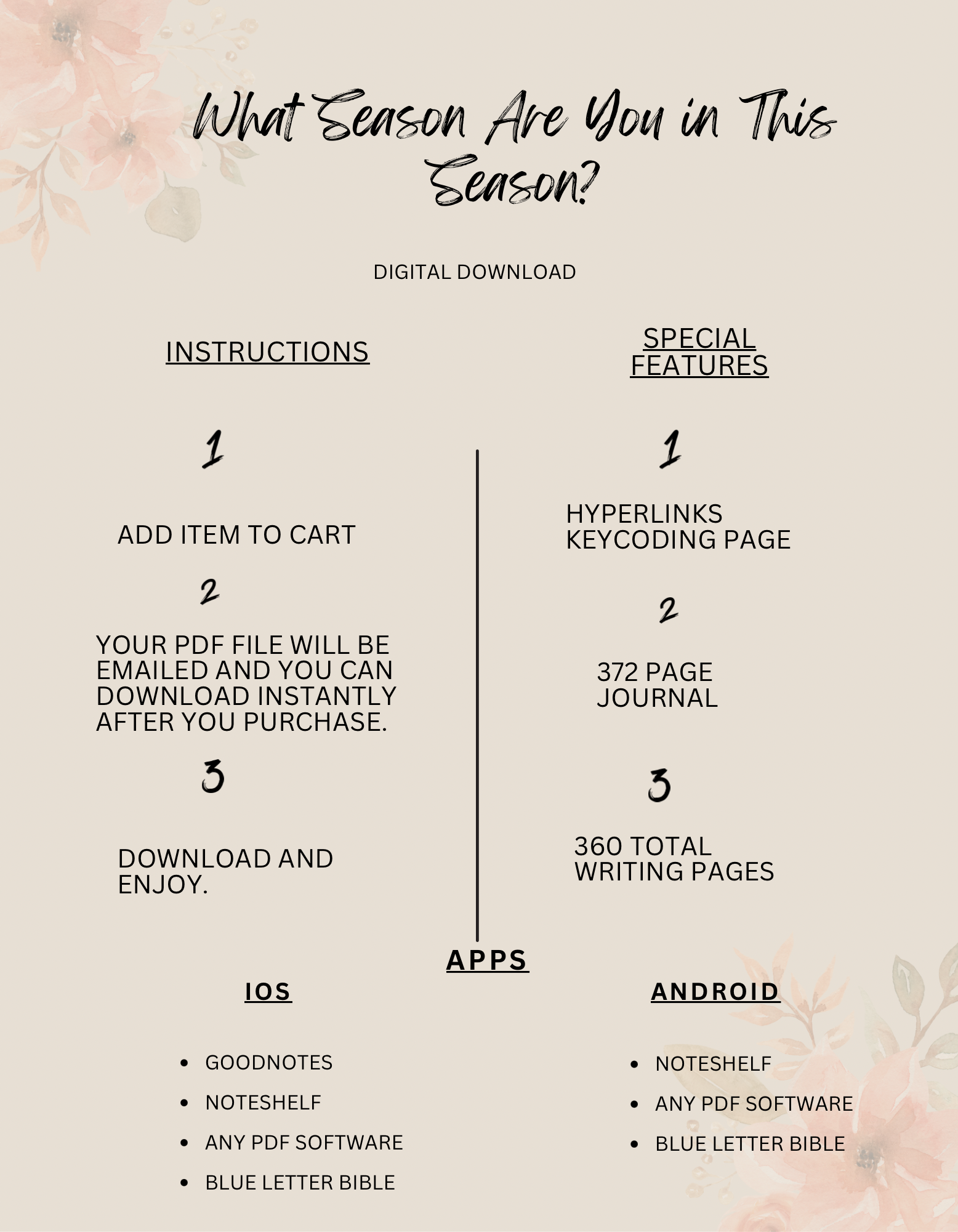 The Seasons Prayer Journal is a digital faith-building tool designed to help you identify the season God has you in—Restoration, Healing, Purpose, Elevation, Wilderness, and more. With guided prompts, daily prayer pages, scripture encouragement, and spiritual check-ins, this journal helps you grow, reflect, and gain clarity in every area of your life.